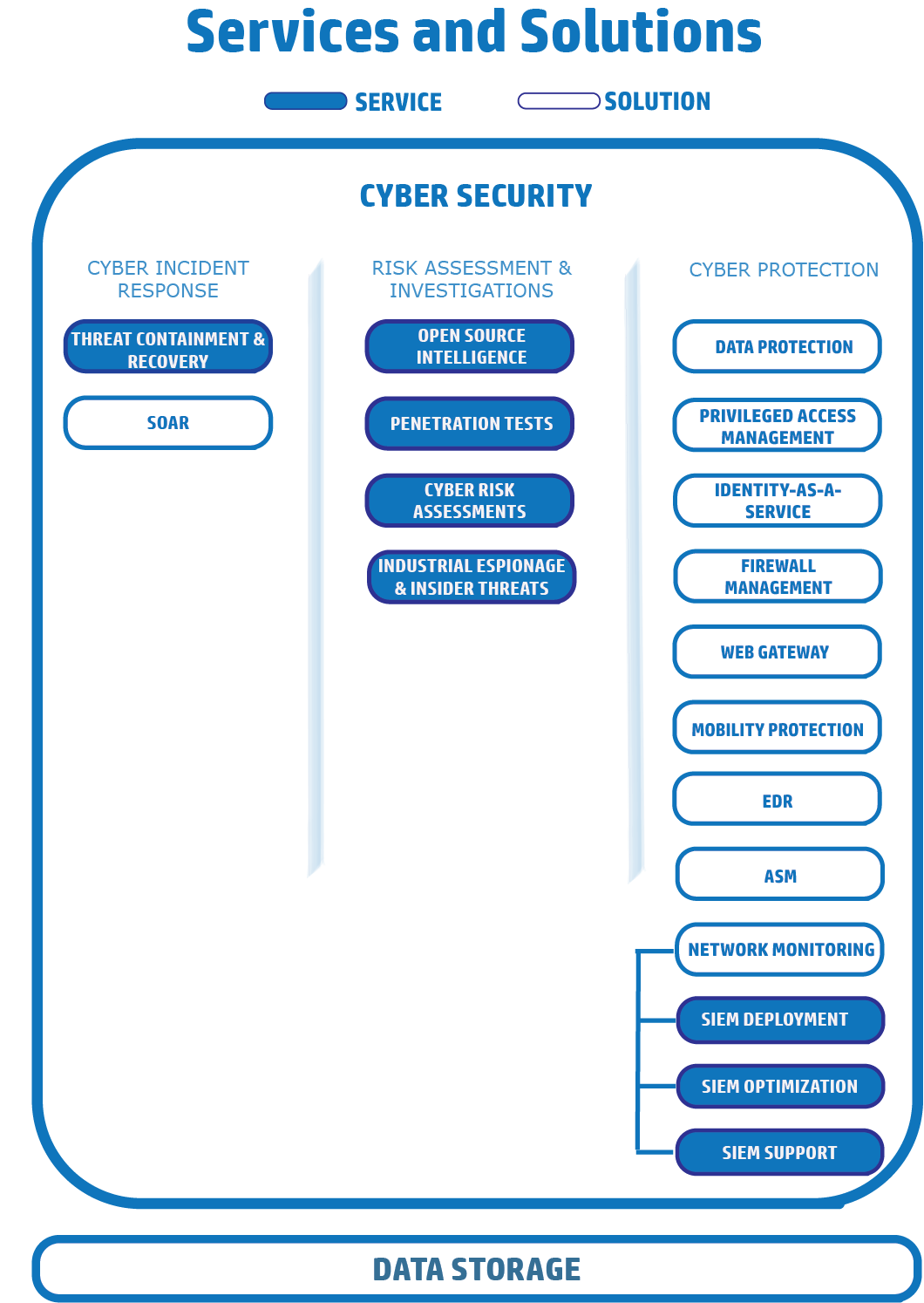 Our set of cyber security solutions constitutes multiple layers of defense. An integrated system of technologies and solutions includes SIEM, Network Monitoring, SOAR, Cloud Identity, MaaS, PAM, Firewall Management, Data Protection, and other solutions supporting on-premise, cloud, and hybrid environments.
